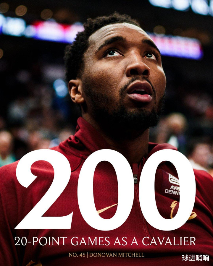 本场比赛也是如此,米切尔19中12轻松砍下31分7板4助1帽,正负值+20全场最高,凭借这样的表现,米切尔骑士生涯已经200次拿下20+,成为骑士队史第5位做到这一点的球员,比肩詹姆斯、布拉德-多尔蒂、欧文和奥斯汀-卡尔。