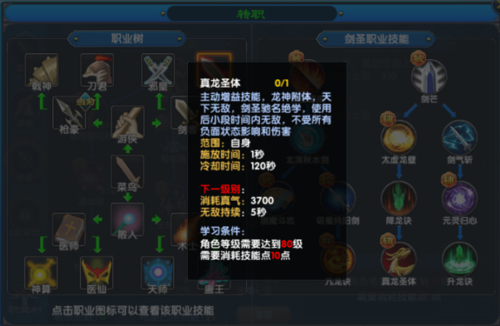 3. 真龙圣体:龙神附体,天下无敌,剑圣驰名绝学,使用后小段时间内无敌,不受所有负面状态影响和伤害。(共一点必满)