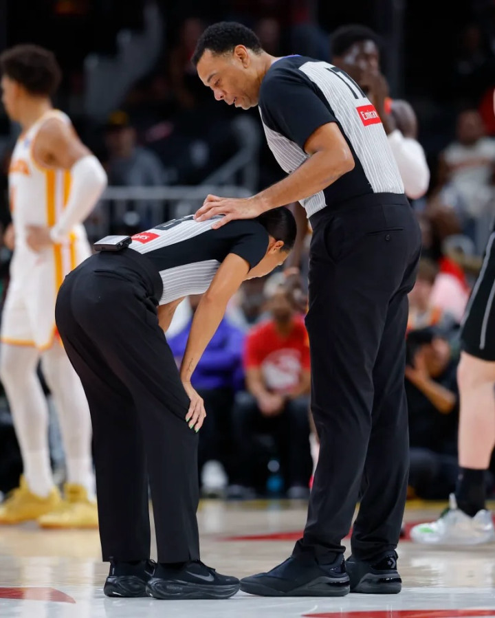 比如,霍姆格伦在这场对阵湖人的比赛中,在第二节比赛一次救球的时候,明明他的脚已经一只脚踩在界外了,裁判就在旁边看着。但是,裁判并没有任何表示。