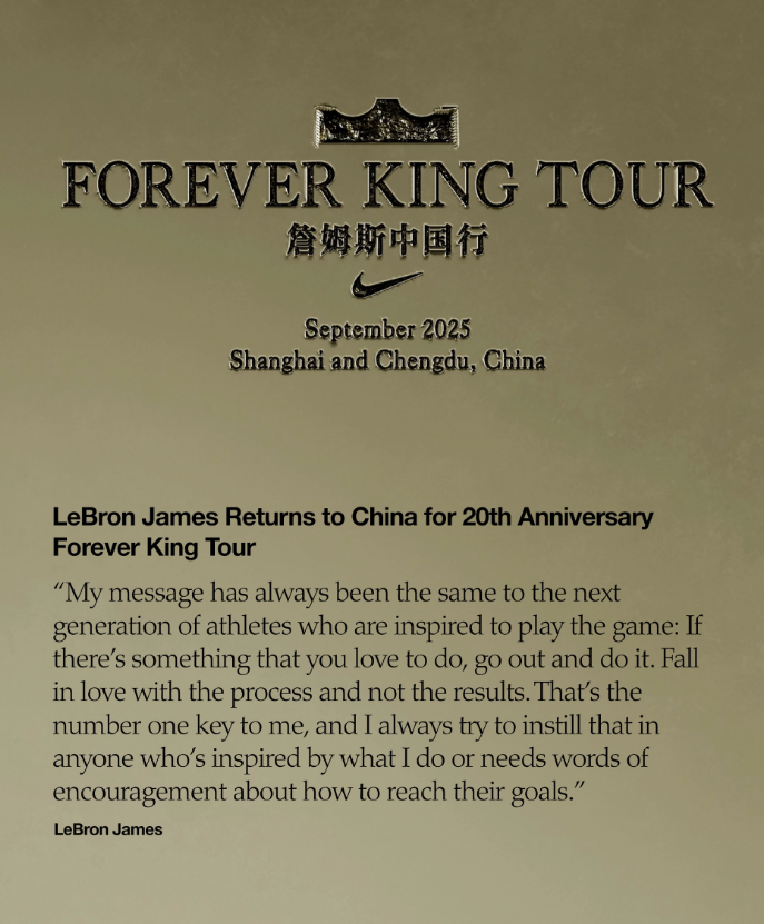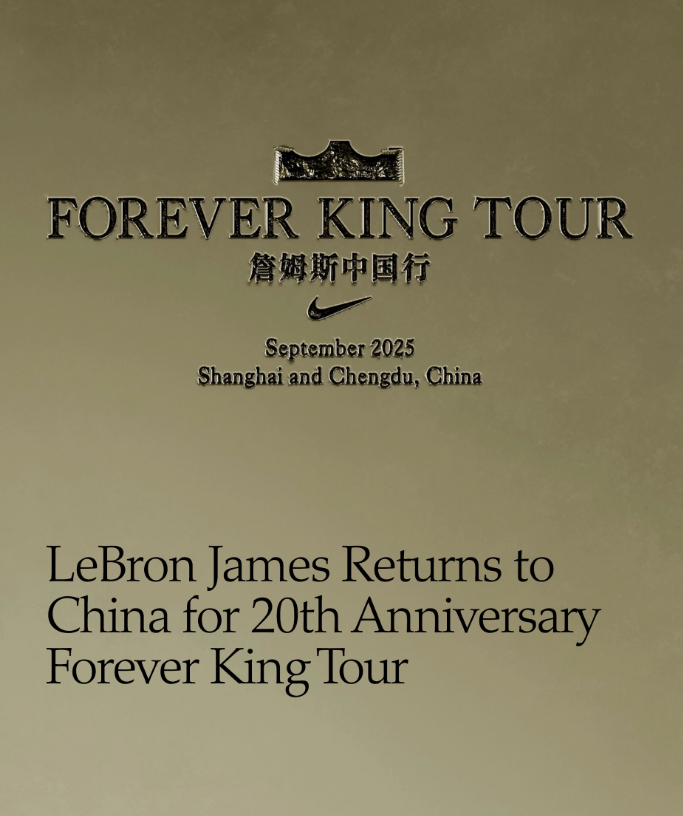 勒布朗·詹姆斯(LeBron James)即将携手耐克开启第15次中国行,这也是距他首次耐克亚洲行20周年。本次中国行是2025“Forever King”篮球之旅的重要一站,他能够借此机会与本地篮球社群再次相聚。