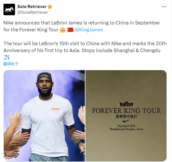 北京时间8月21日,NBA超级巨星勒布朗-詹姆斯即将开启中国行,耐克官方宣布,詹姆斯将于9月来到中国开启2025“Forever King”篮球之旅,这将将是詹姆斯第15次中国行,也是他首次亚洲行的20周年,行程包括上海和成都。