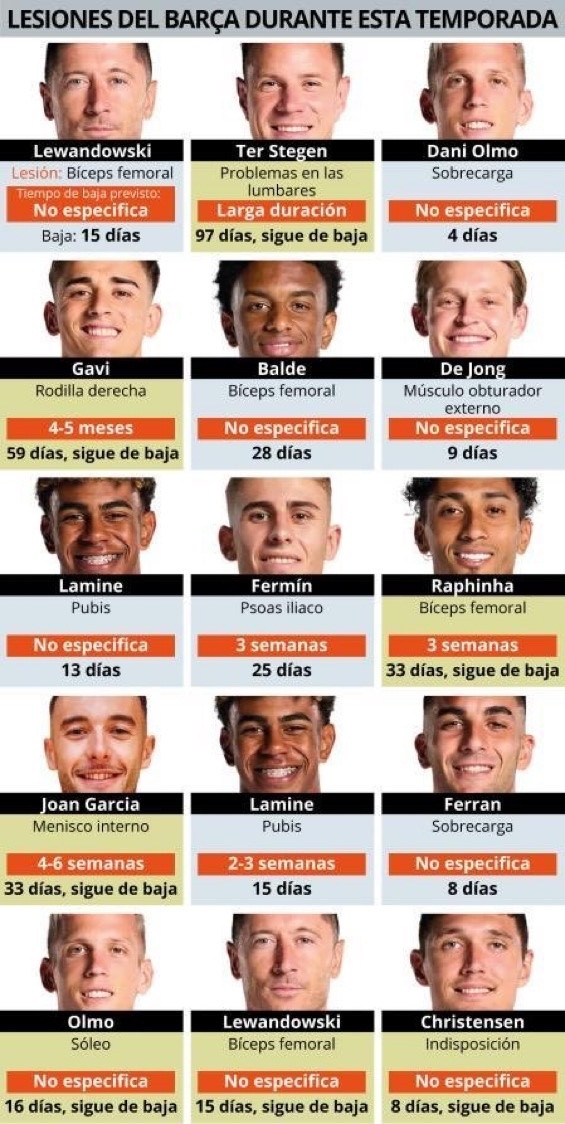 世体总结的巴萨本赛季伤病名单