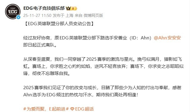 经过友好协商,原EDG英雄联盟分部下路选手安善业(ID:Ahn)即日起正式离队。