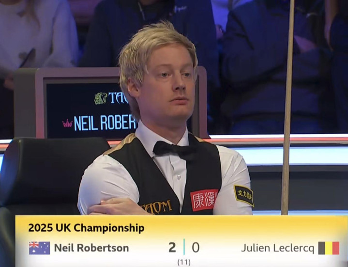 在另外一场较量中,罗伯逊与勒克莱争夺1个16强资格。本场两人的状态都不好,失误很多,比赛进行得比较慢。前3局都是拉锯战,罗伯逊把握机会的能力更好,以2-1领先。第4局中罗伯逊完成一杆105分,比分来到3-1。在接下来一局中,勒克莱单杆57分,缩小了局分差距。