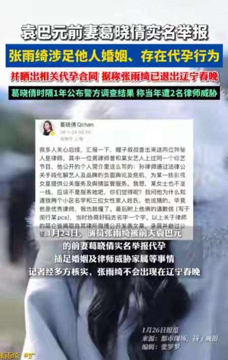 2026年1月24日,葛晓倩公开实名举报张雨绮,她拿出经过公证的材料,指出张雨绮在2017年7月和10月分别生育一对龙凤胎,前后间隔不到三个月,按照通常情况,自然怀孕不可能在这么短时间内连续生育两个孩子,她还提到这件事可能涉及违法代孕,消息一出来,网上立刻引起热议。