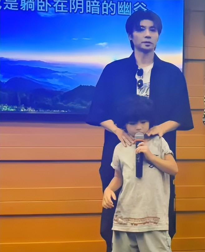 就连6岁的小鱼蛋都拿着话筒在唱歌,一头卷发造型简直是太可爱了,张晋站在儿子身后神情严肃,像是在思考什么。