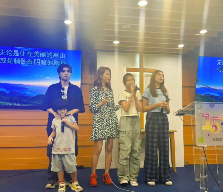 蔡少芬一家站在讲台上,从背影看他们身处的应该是香港的某座教堂。