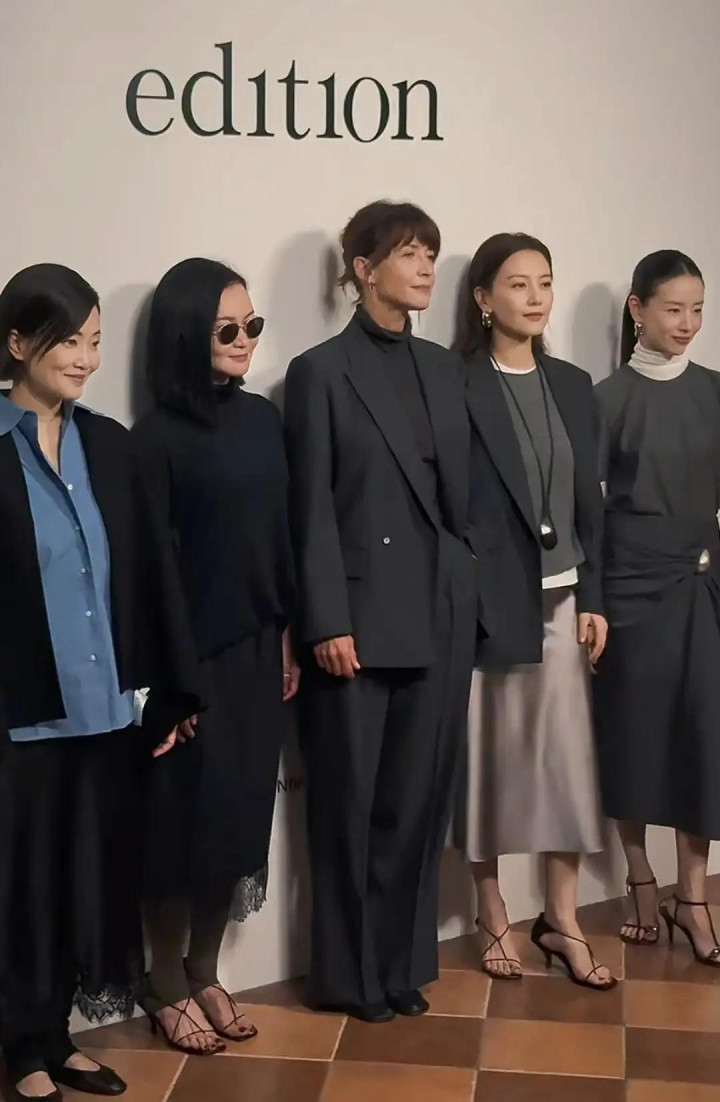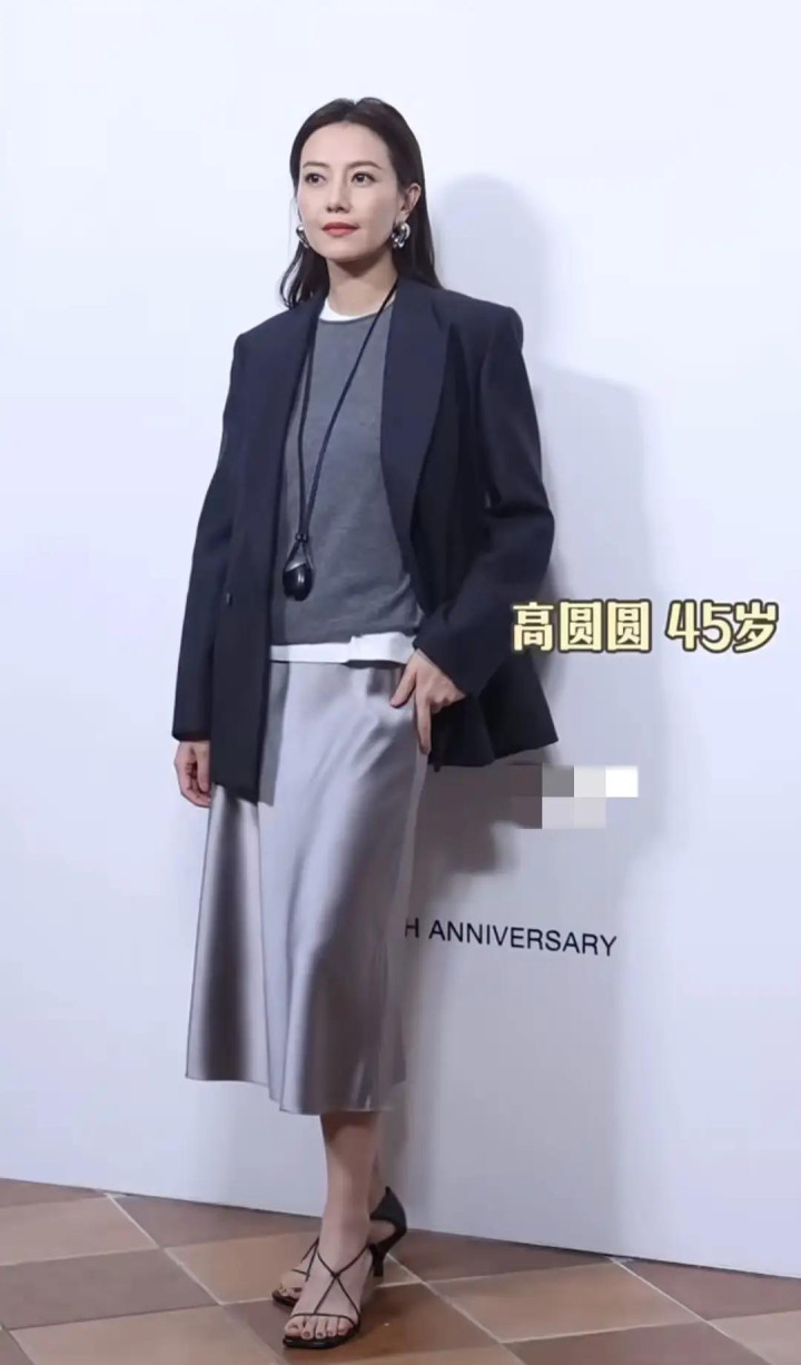 同样是45岁的董洁,却被“大背头”和灰色长裙拖了后腿。说真的,这身造型对她来说有点太端着了,董洁本身属于偏文艺、休闲风格,这次硬要往女强人那边靠,结果反而显得有些拘谨,像小孩子穿上大人的衣服,怎么看怎么别扭。高跟鞋虽然比高圆圆还高,但身形却更瘦、更单薄,站在高圆圆和旁边的苏菲玛索中间,本就不占优势——这气场仿佛一秒就见高低。