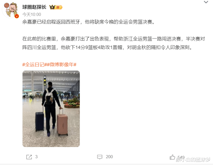 浙江男篮VS广东男篮的全运会决赛即将开打,但在这场决赛之前,余嘉豪已经登上了返回西班牙的航班,他在半决赛拿到14+9帮助浙江爆冷击败四川队后就已经连夜返回西乙,这引发了巨大的争议。