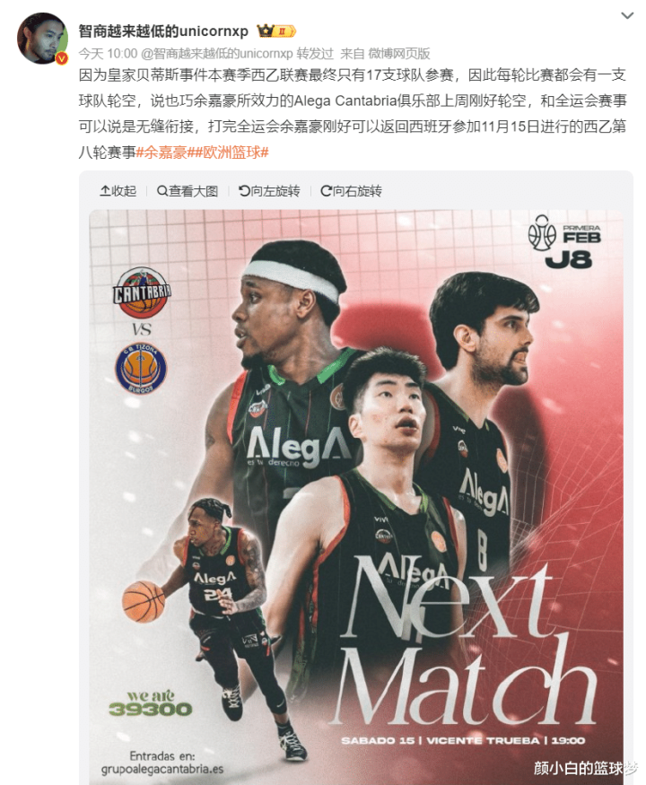 欧洲篮球专家王健也表示,因为皇家贝斯迪事件本赛季西乙只有17支球队参赛,每轮比赛会有一支球队轮空,埃斯特拉男篮上周刚好轮空跟全运会比赛无缝衔接,下一场比赛是在11月15日。(对啊,那余嘉豪11月12日晚打完全运会决赛再回西班牙也不迟啊)